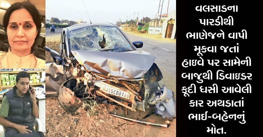વલસાડના પારડીથી ભાણેજને વાપી મૂકવા જતાં હાઇવે પર સામેની બાજુથી ડિવાઇડર કૂદી ધસી આવેલી કાર અથડાતાં ભાઈ-બહેનનું મોત