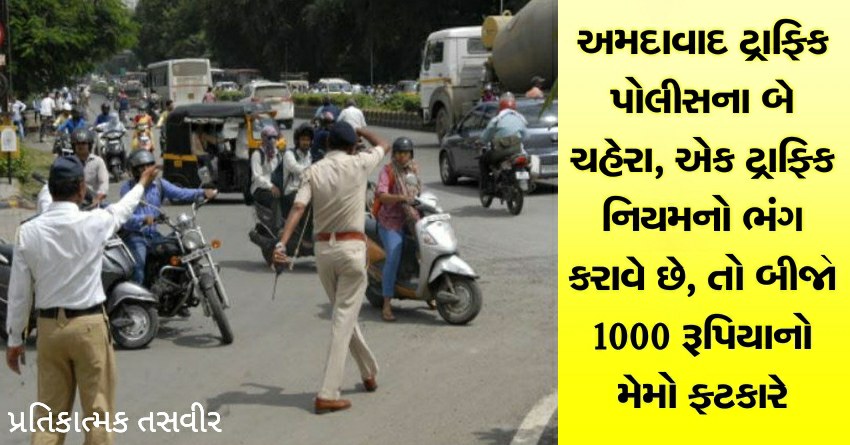 અમદાવાદ ટ્રાફિક પોલીસના બે ચહેરા, એક ટ્રાફિક નિયમનો ભંગ કરાવે છે, તો બીજો 1000 રૂપિયાનો મેમો ફટકારે છે
