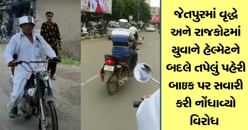 જેતપુરમાં વૃદ્ધે અને રાજકોટમાં યુવાને હેલ્મેટને બદલે તપેલુું પહેરી બાઇક પર સવારી કરી નોંધાવ્યો વિરોધ