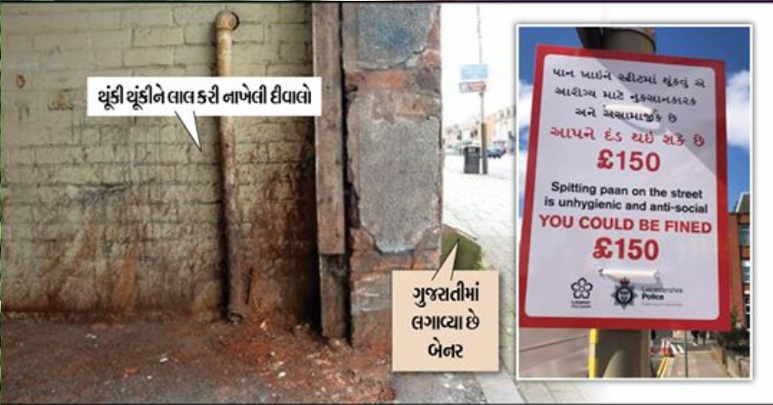 ગુજરાતમાં પાન-મસાલા ખાઈને જ્યાં ત્યાં થૂંકતા લોકોનો ત્રાસ તો છે જ પણ હવે વિદેશમાં પણ લોકો ગુજરાતીઓની આ આદતને કારણે ત્રાસી ગયા છે. ગુજરાતીઓએ વિદેશમાં પણ પાન-મસાલા ખાઇને બિલ્ડિંગ, ઝાડ, રસ્તા વગેરે જેવી જગ્યાઓ થૂંકી થૂંકીને ગંદી કરી છે. જેને કારણે ઇંગ્લેન્ડની સરકારે ગુજરાતીઓ સામે લાલ આંખ કરી છે. ઇંગ્લેન્ડમાં હેરો, લેટેસ્ટર, બ્રેન્ટ જેવી અલગ અલગ કાઉન્સિલે ઠેર રસ્તા પર અને રિક્ષા-કાર જેવા ટ્રાન્સપોર્ટેશનના સાધનો પર ગુજરાતી ભાષામાં બેનરો લગાવી ગંદકી ન ફેલાવવા અપીલ કરી છે. સાથે જ જો કોઈ થૂંકતા પકડાશે તો તેમને દંડ કરવામાં આવશે તેવી જાહેરાત પણ કરી છે.