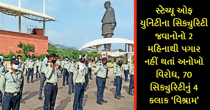 સ્ટેચ્યૂ ઓફ યુનિટીના 70 સિક્યુરિટી જવાનોનો 2 મહિનાથી પગાર નહીં થતાં રોષે ભરાયા હતાં. શુક્રવારે સવારે 8 થી બપોરે 12 વાગ્યા સુધી જવાનોએ એસઓયુ પરિસરમાં સોશિયલ ડિસ્ટન્સ સાથે વિશ્રામની સ્થિતિમાં ઉભા રહી અનોખો વિરોધ કર્યો હતો. ઉચ્ચ અધિકારીઓએ આશ્વાસન આપ્યા બાદ સાંજે જવાનોને એક મહિનાનો પગાર ચૂકવી દેવાયો હતો.