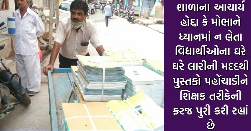 છેલ્લા કેટલાક મહિનાથી lockdown ની જાહેરાત બાદ સ્કૂલો પણ બંધ રાખવામાં આવી હતી અને શિક્ષણ વિભાગની સુચના મુજબ તેની કામગીરી ચાલી રહી હતીત્યારે હાલમાં શિક્ષણ વિભાગની સુચના મુજબ તારીખ 8 જૂનથી શૈક્ષણિક સત્રનો આરંભ થઈ ચૂક્યો છે. પરંતુ તેના માટે વિદ્યાર્થીઓને સ્કૂલ કે શાળાએ જવાનું નથી અને જે તે જિલ્લા માંથી પ્રાથમિક શિક્ષણ એટલે કે 1 થી 8 ધોરણ સમાવિષ્ટ કક્ષાના પુસ્તકો સરકાર તરફથી મળતા રહ્યા છે તે પુસ્તકોને જે તે શાળાના શિક્ષકોએ વિદ્યાર્થી ના ઘરે પહોંચતા કરવાના હોવાથી ચાંદોદ પંથકની 13 શાળાના ગ્રુપાચાર્ય દેવેન્દ્રભાઈ નાયક પોતે શાળાના આચાર્ય તેમજ ગ્રુપાચાર્ય ના હોદ્દા કે મોભાને ધ્યાનમાં ન લેતા પોતાની શિક્ષક તરીકેની ફરજ નિષ્ઠાને અદા કરવા તેઓ સરકાર તરફથી વિદ્યાર્થીઓ માટે આવેલા પુસ્તકોને ઘરે-ઘરે લારી ની મદદથી પહોંચાડતા રહ્યા છે.