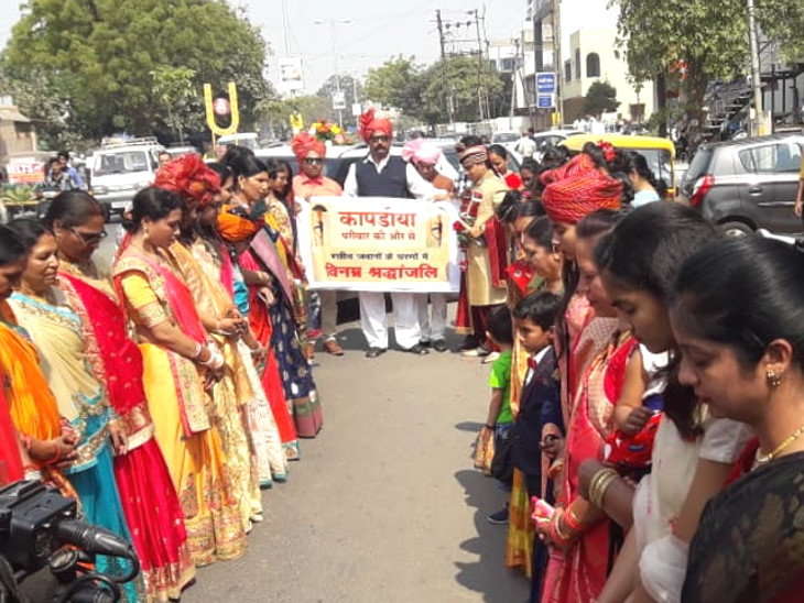 વડોદરા શહેરના કાપડિયા પરિવારે જમ્મુ કાશ્મીરના પુલવામામાં આતંકી હુમલામાં શહીદ થયેલા સીઆરપીએફના જવાનોને અનોખી રીતે શ્રદ્ધાંજલિ આપી હતી. વડોદરાના ગોત્રી વિસ્તારમાં રહેતા કાપડિયા પરિવારે શ્રદ્ધાંજલિના બેનર્સ સાથે લગ્નનો વરઘોડો કાઢ્યો હતો. અને વરઘોડામાં લગ્ન ગીતોને બદલે દેશ-ભક્તિના ગીતો વાગ્યા હતા.