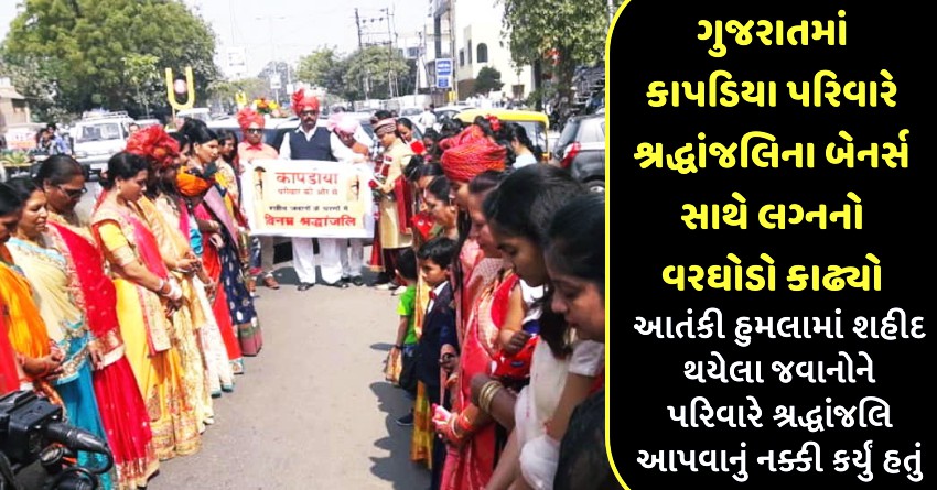 વડોદરામાં 44 શહીદ જવાનોને શ્રદ્ધાંજલિ, વરઘોડામાં લગ્નગીતોના બદલે ગવાયા દેશભક્તિના ગીતો / કાપડિયા પરિવારે શ્રદ્ધાંજલિના બેનર્સ સાથે લગ્નનો વરઘોડો કાઢ્યો, આતંકી હુમલામાં જવાનો શહીદ થતા પરિવારે જવાનોને શ્રદ્ધાંજલિ આપવાનું નક્કી કર્યું..