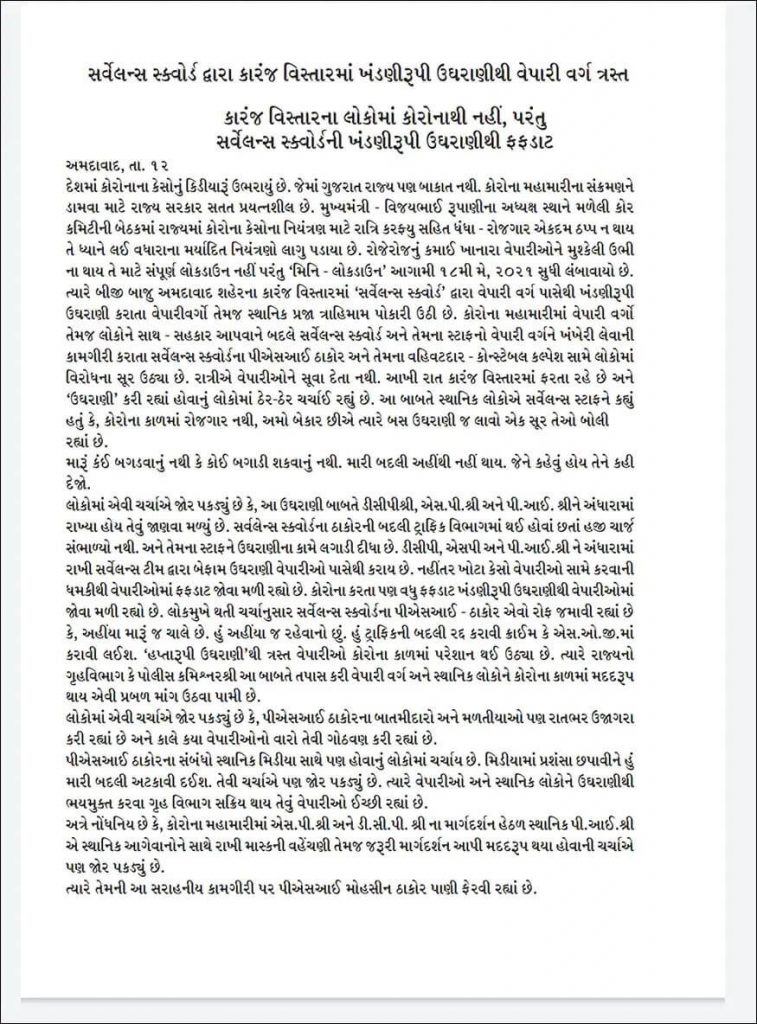 સર્વેલન્સ સ્ક્વૉડના પીએસઆઈ ઠાકોર અને કોન્સ્ટેબલ કલ્પેશ સામે લોકોમાં વિરોધના સૂર ઉઠ્યા છે. રાત્રે વેપારીઓને ઊંઘવા દેતા નથી અને કારંજ વિસ્તારમાં ફરતા રહી ઉઘરાણી કરી રહ્યા હોવાનું લોકોમાં ચર્ચાઇ રહ્યું હોવાનો આ પત્રમાં આક્ષેપ કરવામાં આવ્યો છે. કોરોના કાળમાં રોજગાર નથી, લોકો બેકાર છે છતાં પણ માત્ર ઉઘરાણી લાવો તેવું કહી રહ્યા હોવાનો આક્ષેપ કરવામાં આવ્યો છે. આટલું જ નહીં પીએસઆઇ ઠાકોર પોતાનું કહી બગડવાનું નથી કે કોઈ બગાડી શકવાના નથી, અહીંથી બદલી પણ નહીં થાય તેવું લોકોને કહી રહ્યા હોવાનું ચર્ચાઈ રહ્યું છે.