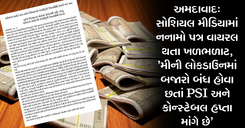 અમદાવાદ: સોશિયલ મીડિયામાં નનામો પત્ર વાયરલ થતા ખળભળાટ, ‘મીની લોકડાઉનમાં બજારો બંધ હોવા છતાં PSI અને કોન્સ્ટેબલ હપ્તા માંગે છે’