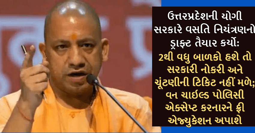 ઉત્તરપ્રદેશની યોગી સરકારે વસતિ નિયંત્રણનો ડ્રાફ્ટ તૈયાર કર્યો: 2થી વધુ બાળકો હશે તો સરકારી નોકરી અને ચૂંટણીની ટિકિટ નહીં મળે; વન ચાઇલ્ડ પોલિસી એક્સેપ્ટ કરનારને ફ્રી એજ્યુકેશન અપાશે