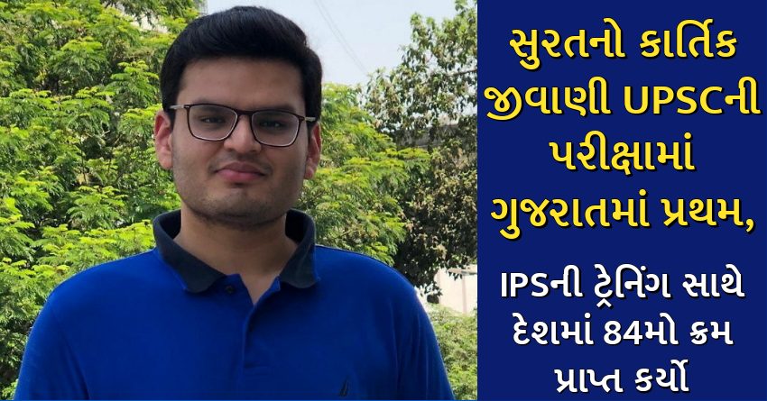 જાહેર થયેલા UPSCના પરિણામોમાં સુરતનો કાર્તિક નાગજીભાઈ જીવાણીએ ભારતમાં 84મો ક્રમ અને ગુજરાતમાં પ્રથમ રેન્ક પ્રાપ્ત કર્યો છે. તેની ઈચ્છા મુજબ જો તેને IAS કેડર મળશે તો તે સુરતનો પ્રથમ IAS અધિકારી બનશે. કાર્તિક સુરતની જ પીપી સવાણી અને રાયન ઈન્ટરનેશનલ સ્કૂલમાં 12 સુધી અભ્યાસ કર્યા બાદ મુંબઈની IITમાંથી મિકેનિકલમાં બીટેક થયો છે.કાર્તિકે પ્રાથમિક શિક્ષણ માતૃભાષામાં મેળવ્યું છે.