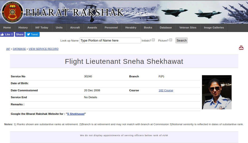 A website called Bharat Rakshak, which contains a database of military personnel and officers, has listed Shekhawat as an IAF officer and has used the same photo in her profile.