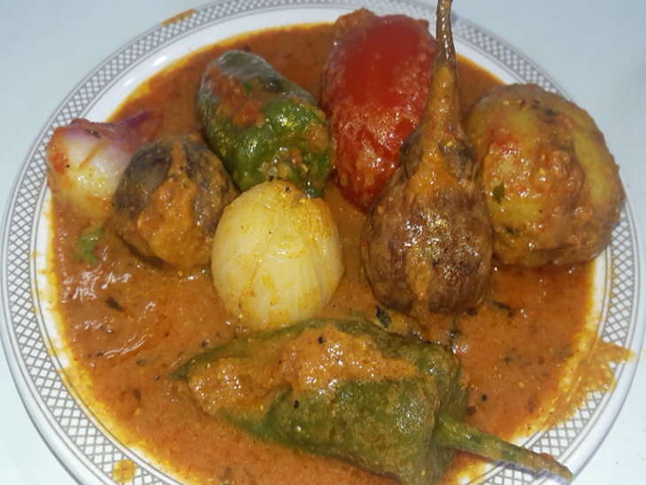 શાકને વરાળથી બાફવા માટે એક મોટા સ્ટીલના તપેલામાં કપચી ભરી લો. કપચીનું 2 ઈંચ જેટલું લેયર કરવું. ત્યારબાદ કપચીના લેવલથી થોડું ઓછું પાણી ભરો. સ્ટવની મિડિયમ રાખી ગરમ થવા દો. ત્યારબાદ કાપા પાડેલ રીંગણ, બટાકાં અને મરચાંમાં સ્ટફિંગનો મસાલો દબાવી-દબાવીને ભરી લો. ડુંગળીમાં મસાલો ભરવાની જરૂર નથી. ટામેટાંમાં પણ સ્ટફિંગ ભરી લો.