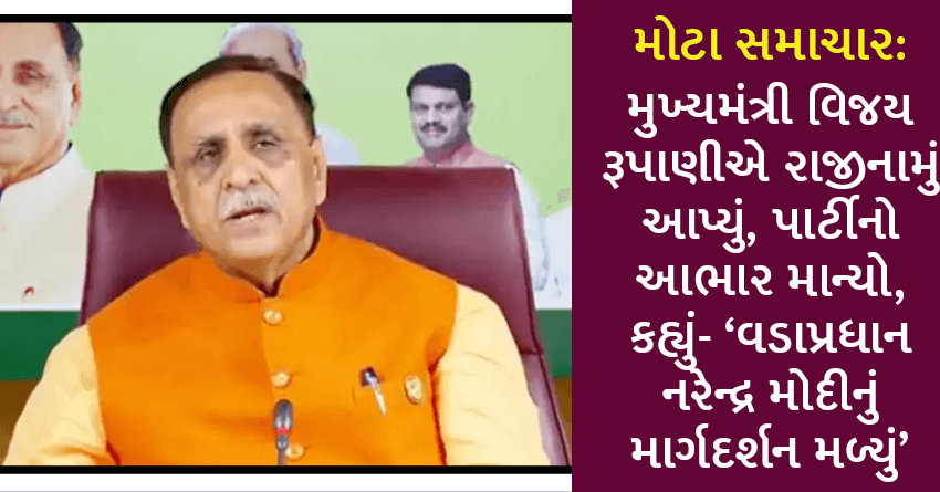 મોટા સમાચાર: મુખ્યમંત્રી વિજય રૂપાણીએ રાજીનામું આપ્યું, પાર્ટીનો આભાર માન્યો, કહ્યું- ‘વડાપ્રધાન નરેન્દ્ર મોદીનું માર્ગદર્શન મળ્યું’