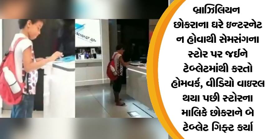 સોશિયલ મીડિયા પર સેમસંગના સ્ટોર પર એક છોકરો ટેબ્લેટમાંથી હોમવર્ક કરી રહ્યો હોય તેવો વીડિયો વાઇરલ થઈ રહ્યો છે. 10 નવેમ્બરે શેર થયેલા આ વીડિયોને ટ્વિટર પર અત્યાર સુધીમાં 1 કરોડ 20 લાખ લોકોએ જોયો છે.