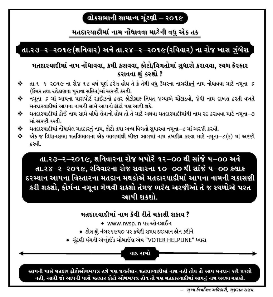 ખાસ ઝુંબેશ અંતર્ગત આગામી તા.૨૩ અને ૨૪મી ફેબ્રુઆરી-૨૦૧૯ના સવારે ૧૦ થી સાંજે ૫ વાગ્યા દરમ્યાન બંને દિવસોએ રાજયની તમામ વિધાનસભા મતવિભાગોમાં પ્રત્યેક મતદાન મથક ખાતે બુથ લેવલ ઓફિસર ઉપસ્થિત રહેશે. જયાં મતદારયાદીની વિગતો ચકાસી શકાશે. તેમજ મતદારયાદીમાં મતદાર તરીકે નોંધણી કરાવવા માટે ફોર્મ ભરીને સ્થળ પર રજુ કરી શકાશે. ઉપરાંત મતદારયાદીમાં રહેલા મતદારો પૈકી લાગુ કિસ્સામાં નામ કમી માટે, ફોટો, વિગતો સુધારવા માટે, સ્થળ ફેરફાર માટે ફોર્મ ભરીને રજુ કરી શકાશે. નિયત નમૂનાના કોરા ફોર્મ મતદાન મથક ખાતે ઉપસ્થિત બુથ લેવલ ઓફિસર પાસે ઉપલબ્ધ રહેશે.