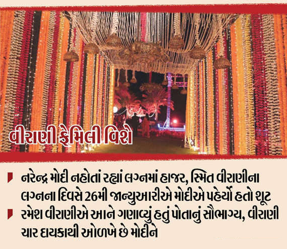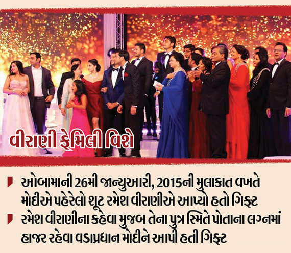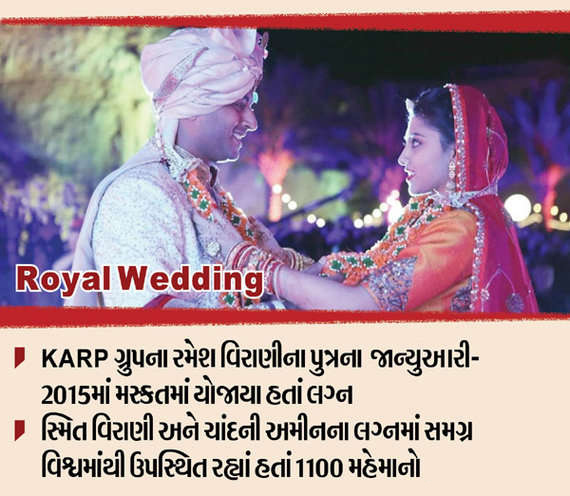ડાયમંડ બિઝનેસ સાથે સંકળાયેલા KARPના રમેશ વિરાણીના પુત્ર સ્મિતના લગ્ન ચાંદની અમીન સાથે 2015માં મસ્કતમાં યોજાયા હતા. આ લગ્ન માટે ખાસ લંડનથી બેન્ડ અને રશિયાથી ડ્રમર બોલાવવામાં આવ્યા હતા. આ ઉપરાંત જાણીતી બોલિવૂડ અભિનેત્રીઓએ સંગીત સેરેમનીમાં પરફોર્મ પણ કર્યું હતું. વડાપ્રધાન મોદીને તેમનું નામ લખેલા શૂટની ભેટ આપનાર રમેશ વિરાણીએ પોતાના પુત્રના લગ્નમાં પણ આકર્ષણ જમાવ્યું હતું.