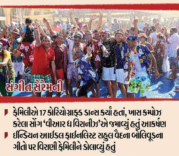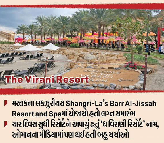 ઓમાનના મસ્કતમાં યોજાયેલા ચાર દિવસીય આ ભવ્ય લગ્નમાં આશરે 1100થી વધારે મહેમાનો હાજર રહ્યાં હતા. આ લગ્ન માટે મસ્કતના લક્ઝુરિયસ Shangri-La’s Barr Al-Jissah Resort And Spaને ચાર દિવસ માટે ‘ધ વિરાણી રિસોર્ટ’ નામ આપવામાં આવ્યું હતું. ગુજરાતી પરંપરા અનુસાર યોજાયેલા આ લગ્નમાં રિંગ સેરેમની, મહેંદી, સંગીત, વેડિંગ ડે ઉપરાંત પુલ પાર્ટી અને બોલિવૂડ ઈવનિંગનું પણ આયોજન કરાયું હતું.