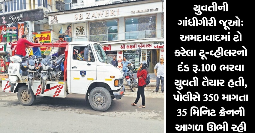યુવતીની ગાંધીગીરી જૂઓ: અમદાવાદમાં ટો કરેલા ટૂ-વ્હીલરનો દંડ રૂ.100 ભરવા યુવતી તૈયાર હતી, પોલીસે 350 માગતા 35 મિનિટ ક્રેનની આગળ ઊભી રહી