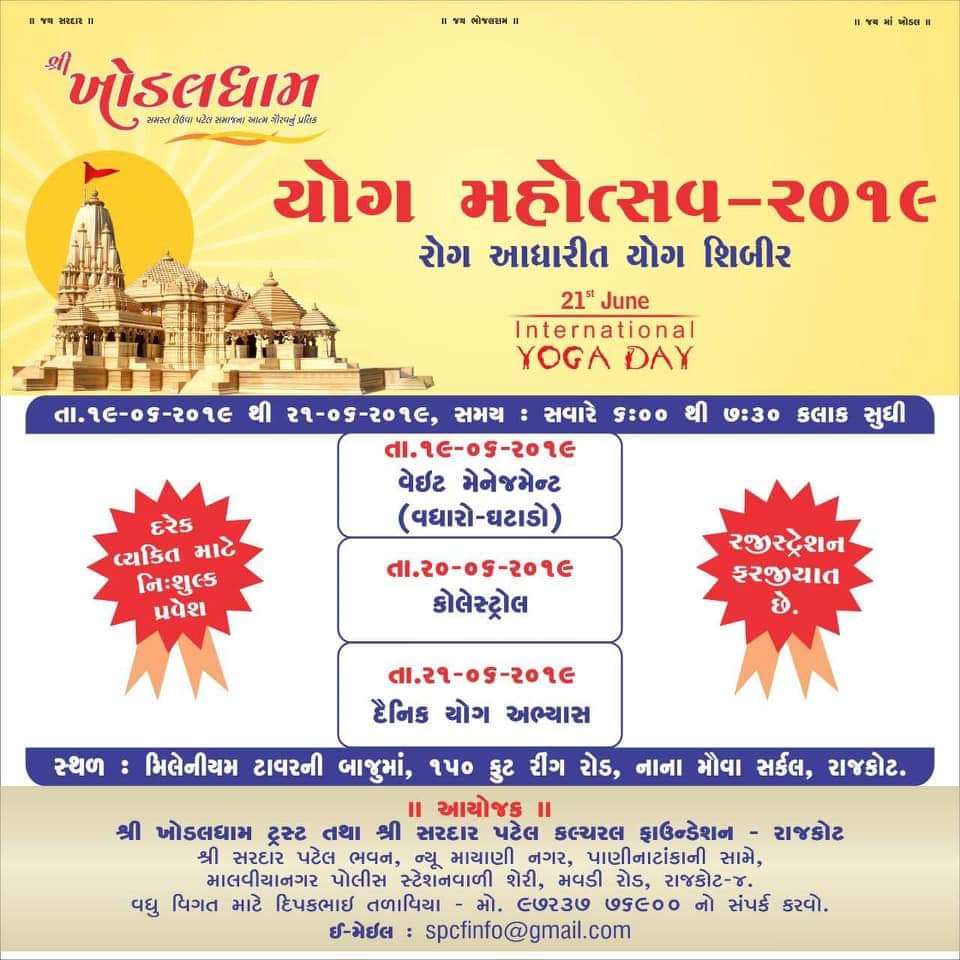 લેઉવા પટેલ સમાજના આસ્થાના પ્રતિક સમાજ ખોડલધામ મંદીરનું નિર્માણ કરનાર ખોડલધામ ટ્રસ્ટ તેમજ કારકીર્દી ઘડતર અને સેવાકીય પ્રવૃતિઓ સાથે જોડાયેલ સરદાર પટેલ કલ્ચરલ ફાઉન્ડેશન દ્વારા આગામી તા.21 જુનના રોજ આંતરરાષ્ટ્રીય યોગ દિવસ નીમીતે રાજકોટમાં યોગ મહોત્સવ-2019નું આયોજન કરવામાંઆવેલ છે. આ પ્રસંગે વડોદરા કાયાવરોહણના યોગાચાર્ય સ્વામી મુકતાનંદજી (શ્રીઅનંદ દેવ) કાયાવરોહણ તીર્થ સેવા સમાજ સવાવહોરણ પણ ખાસ ઉપસ્થિત રહેશે.