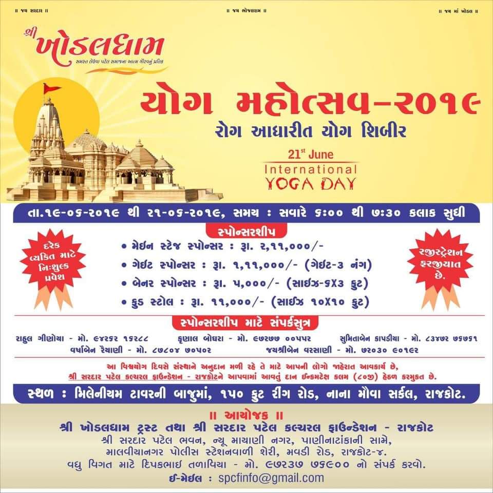 ખોડલધામ ટ્રસ્ટ તથા સરદાર પટેલ કલ્ચરલ ફાઉન્ડેશન દ્વારા યોગ મહોત્સવનું ભવ્ય આયોજન