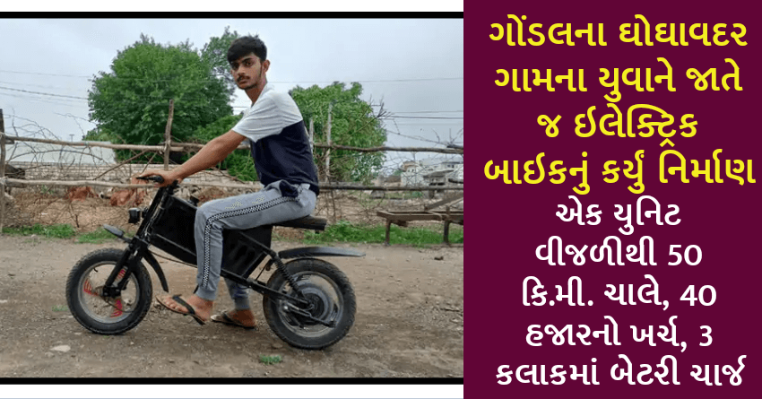 ગોંડલના ઘોઘાવદર ગામના યુવાને જાતે જ ઇલેક્ટ્રિક બાઇકનું કર્યું નિર્માણ, એક યુનિટ વીજળીથી 50 કિ.મી. ચાલે, 40 હજારનો ખર્ચ, 3 કલાકમાં બેટરી ચાર્જ