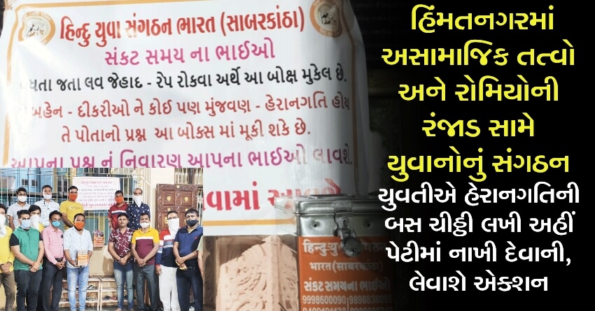 હરિયાણામાં એક નરાધમે સરા જાહેર એક દીકરીની હત્યા કરવાની નૃશંસ ઘટનાના ઘેરા પ્રત્યાઘાત હિંમતનગર શહેરમાં પણ પડ્યા છે. ધર્માંધ આવારા અસામાજિક તત્વોથી પરેશાન મહિલાઓ, યુવતીઓ, અબુધ કિશોરીઓ સમાજમાં બદનામીથી પરેશાન છે અને ડરના કારણે ચૂપ રહે છે. દીકરીઓ અને મહિલાઓની સુરક્ષા માટે હિન્દુ યુવા સંગઠને હિંમતનગરથી પહેલ કરી છે. ઉત્તર ગુજરાતના મુખ્ય શહેરોમાં સાર્વજનિક સ્થળો પર લેટર બોક્સ લગાવાઇ રહ્યા છે. ભોગ બનનાર બહેન દીકરીએ વિશેષ કંઇ કરવાનું નથી. પોતાની સમસ્યા લખીને લેટર બોક્સમાં મૂકી દેવાની છે, બાકીનું કામ સંકટ સમયના ભાઇઓ કરશે.