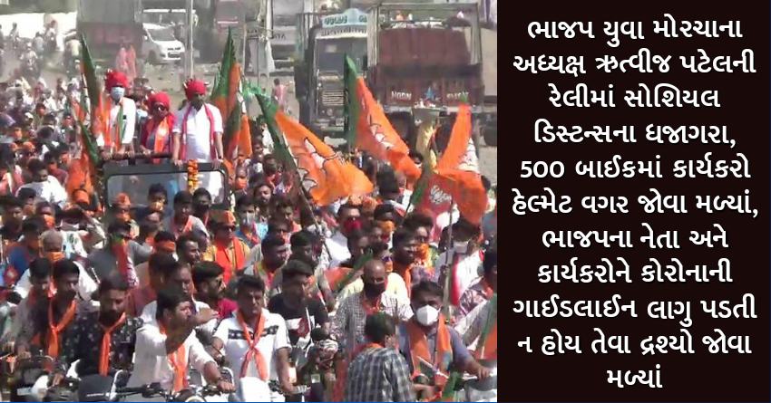 ભાજપ યુવા મોરચાના અધ્યક્ષ ઋત્વીજ પટેલની રેલીમાં સોશિયલ ડિસ્ટન્સના ધજાગરા, 500 બાઈકમાં કાર્યકરો હેલ્મેટ વગર જોવા મળ્યાં, ભાજપના નેતા અને કાર્યકરોને કોરોનાની ગાઈડલાઈન લાગુ પડતી ન હોય તેવા દ્રશ્યો જોવા મળ્યાં